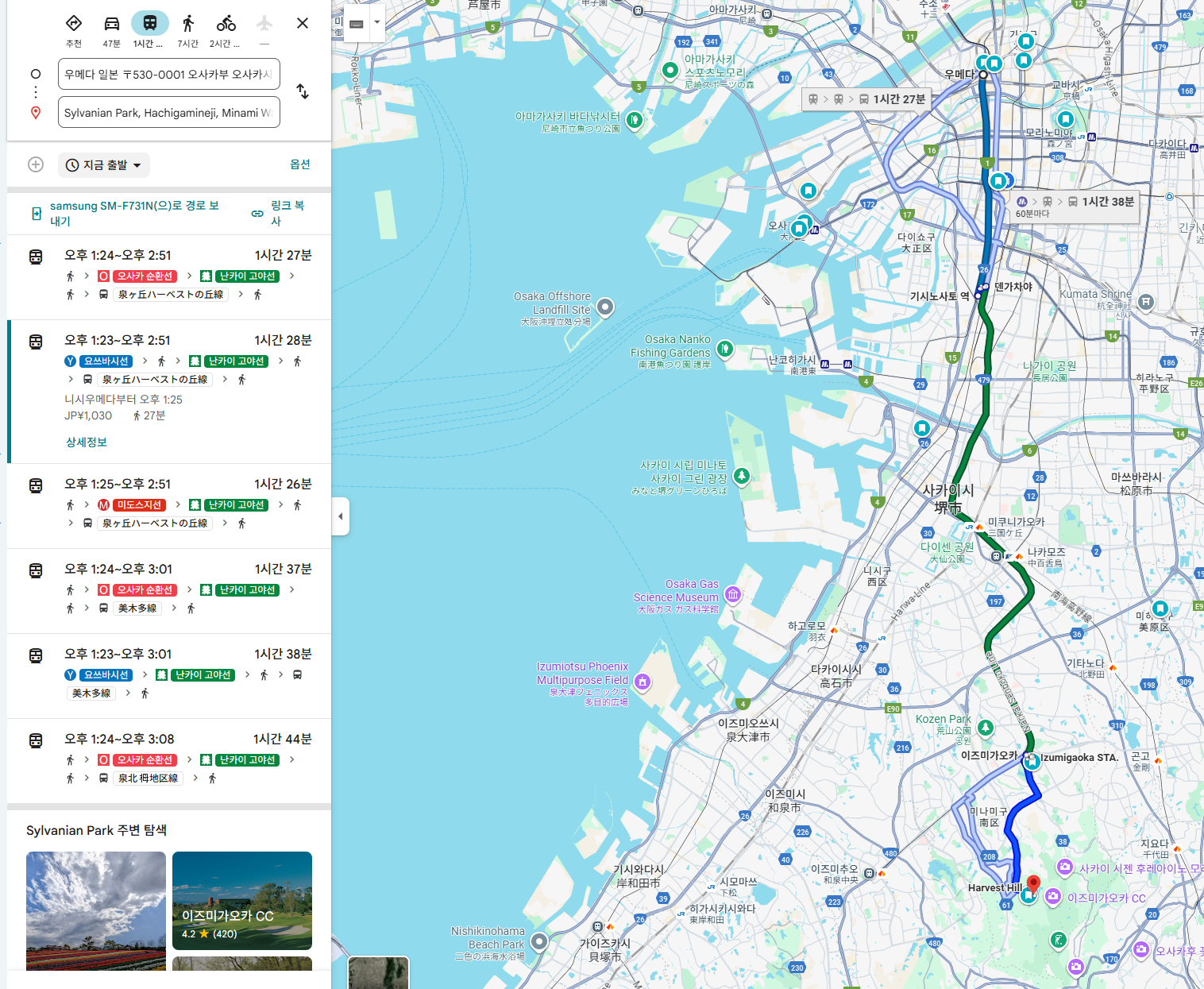 - 이동: 우메다에서 1번의 환승 후 이즈미가오카역 하차 후 셔틀버스타고 이동 1시간 30분정도 걸려요